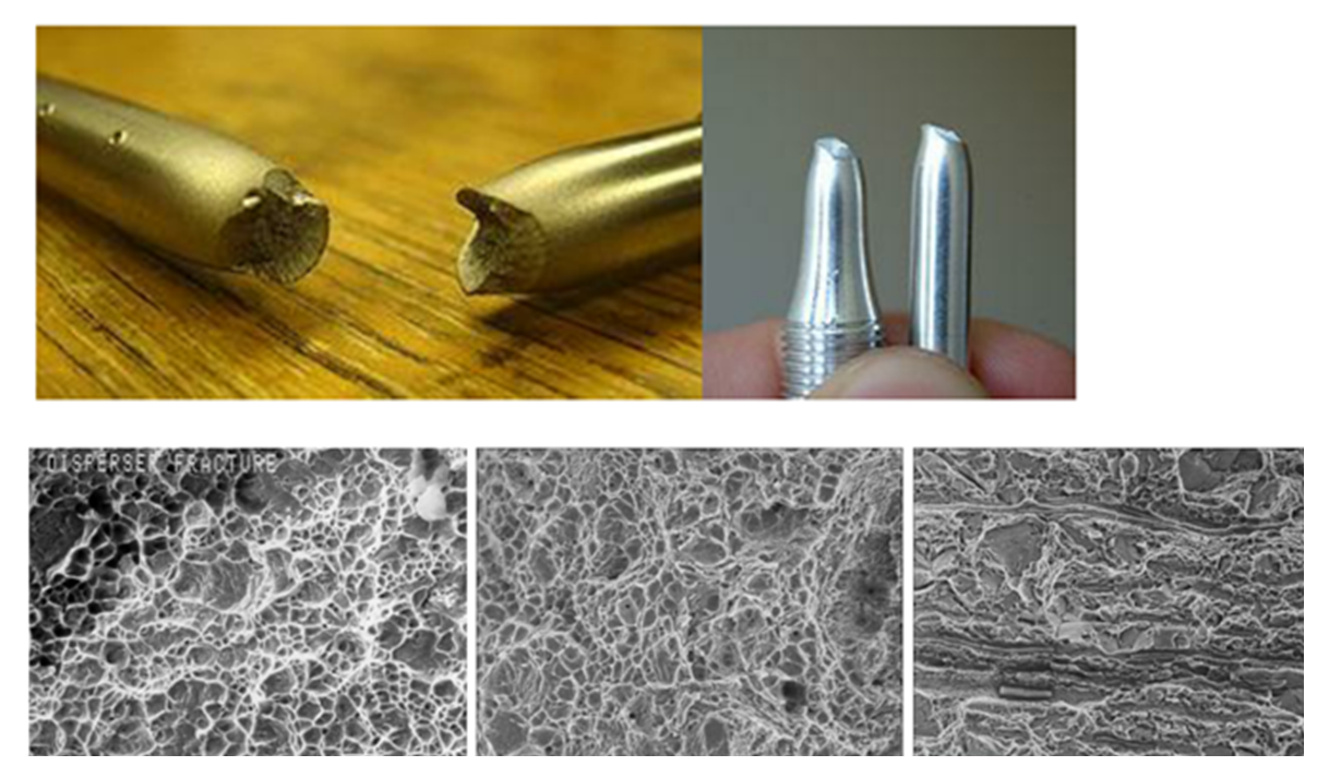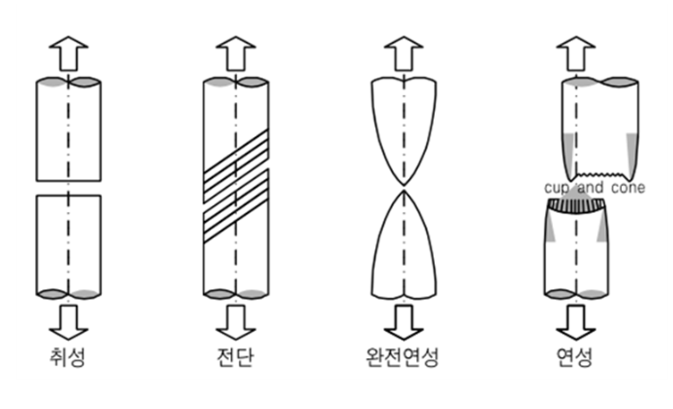 연성파괴는 균열이 전파될 때 파단면 상에 상당한 소성변형이 발생되는 파괴형태로써 파단면은 찢어지는 느낌의 형상으로 구성되어 일반적으로는 큰 단면 감소율을 갖는다. 간혹 눈으로 보기에 취성파괴와 같은 평평한 파단면도 연성파괴로 판정되는데, 여기에 는 주사전자현미경(SEM)으로 확인할 수 있는 딤플(Dimple)이 형성되어 있어 이것이 미세한 소성변형의 공공이 부품의 연성적인 파괴에 기여한 것을 확인할 수 있다.