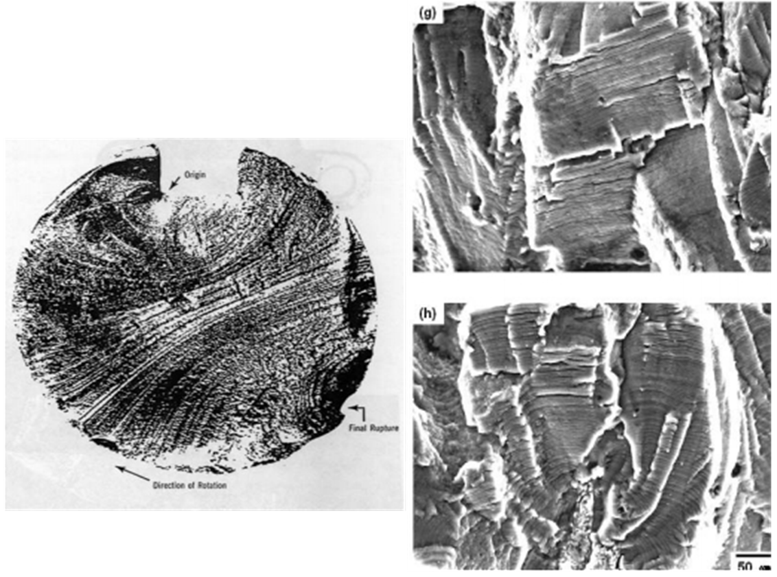 피로파괴는 응력이 반복적으로 가해져 점점 균열이 전파 및 확대하고 결국 파괴에 이르는 것으로 응력 진폭이 정적 강도 이하, 때로는 탄성한(彈性限) 이하에서도 일어난다. 거시적으로는 소성변형이 동반되는 경우가 거의 없지만, 미시적으로는 크든 작든 소성변형이 집적한 결과이다. 피로에 의해 발생한 파손에서 그 파단면은 취성파괴의 한 형태로 규정할 수 있다. 그러나 이것은 일반적인 취성파괴의 특징이 아닌 피로균열 전파에 따르는 새로운 파단의 전형을 갖는다. 피로 균열 전면에는 육안으로 확인되는 비치 마크(Beach mark)외에도 주사전자현미경의 관찰로써 확인할 수 있는 피로 줄무늬(Fatigue striation)가 또 다른 특징으로 발생되어 피로파손을 확인할 수 있는 중요한 근거가 된다.