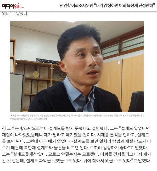 김 교수는 다만 자신이 알고 있는 것이 다가 아니고, 합조단이나 국방부 조사본부가 관할하면서 다른 여러 사유를 판단해서 북한제라 결론을 내렸을 수도 있다고도 말했다. 그는 “발표할 때 보고 알았다. 내가 어뢰 일부 분석에 참여 했으나 설계도를 제시받은 적은 없었다”고 말했다.