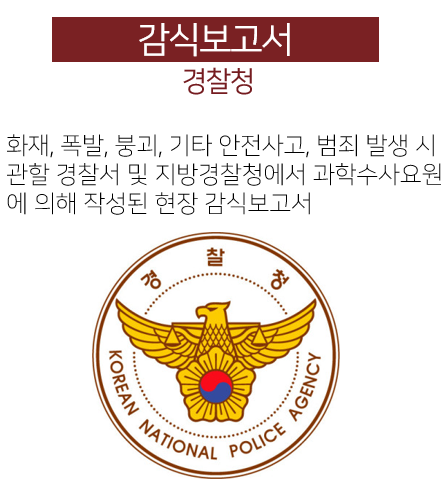 >> 화재, 폭발, 붕괴, 기타 안전사고 발생 시 사고현장에 입회하는 국립과학수사연구원, 소방청, 경찰청, 보험사 등은 원인 분석 및 피해 산정, 책임소재 판단을 위해 각각 법안전감정서, 화재현장조사서, 감식보고서, 손해사정서를 목적에 맞게 작성합니다.
